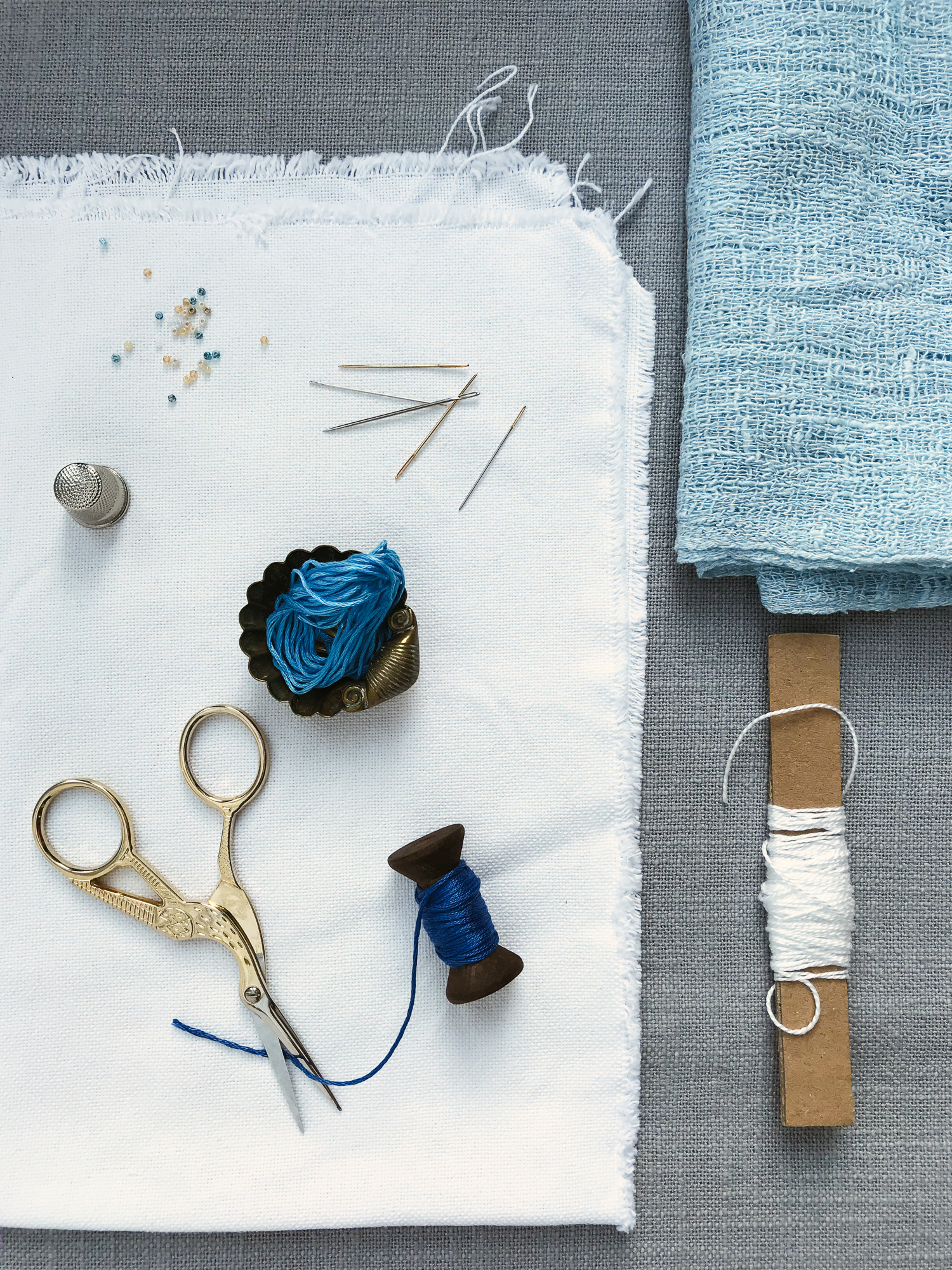 For the sea, I normally work with shades of blue ranging from turquoise to dark blue, and the sky a paler blue. For the waves crashing on the beach, I used a slightly thicker white cotton thread.