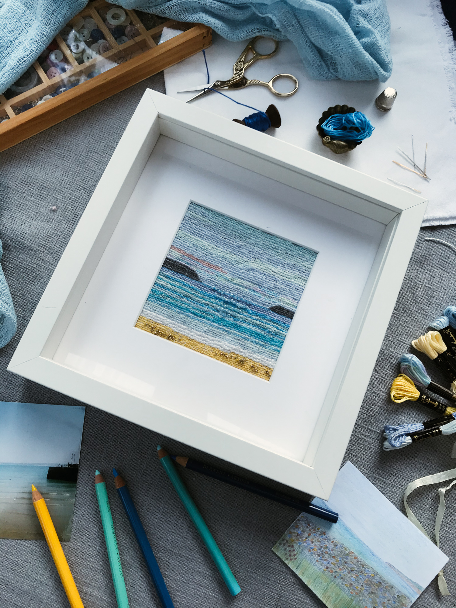 The sea, sky, cliffs, beach, For this project I used Anchor Stranded Cotton threads, but there are a number of other well-known brands. For this project, the important factor is to try and find as many complementary shades as possible for the sea and the sky. Like choosing coloured pencils, the shades of the threads create the atmosphere of the sea and sky.